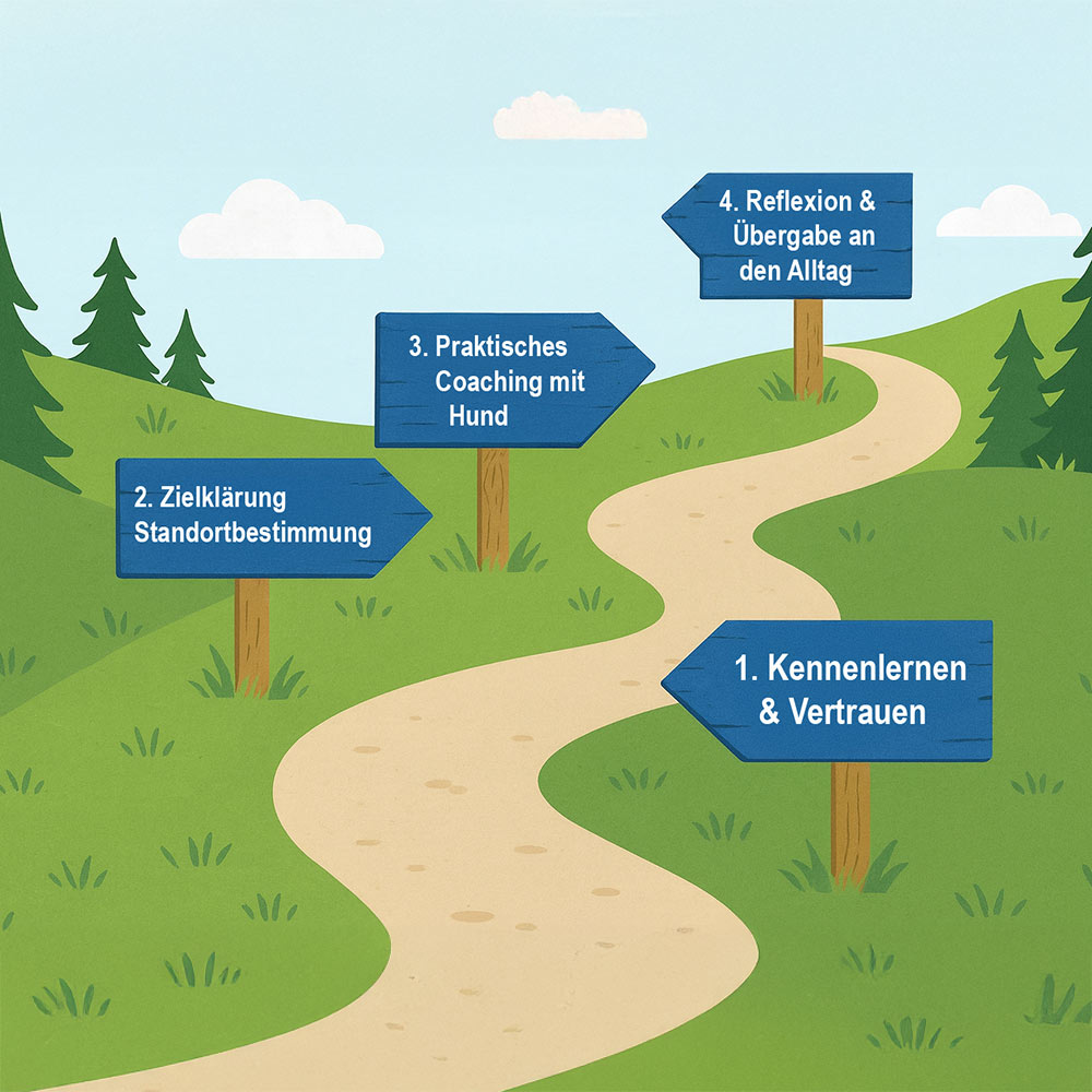 Im Zentrum stehen immer Beziehung, Vertrauen und Bewegung – sowohl innerlich als auch ganz praktisch. Denn unser Coaching findet dort statt, wo Leben geschieht: direkt im Alltag, vor Ort, mit tierischer Unterstützung.